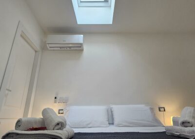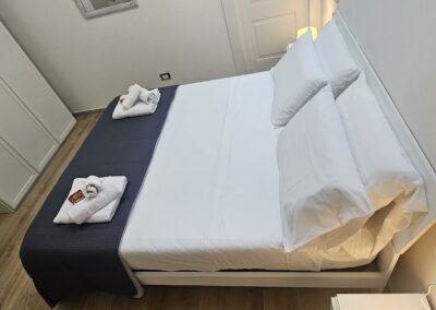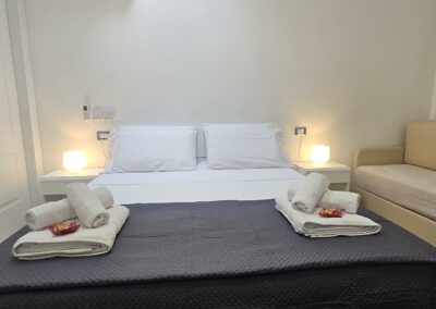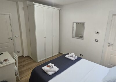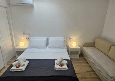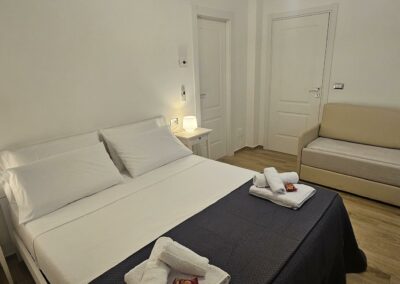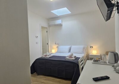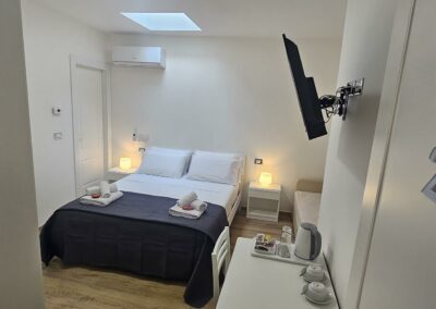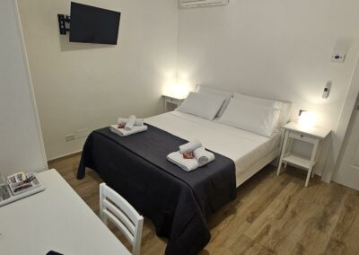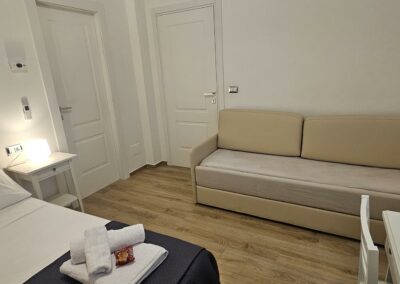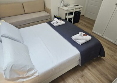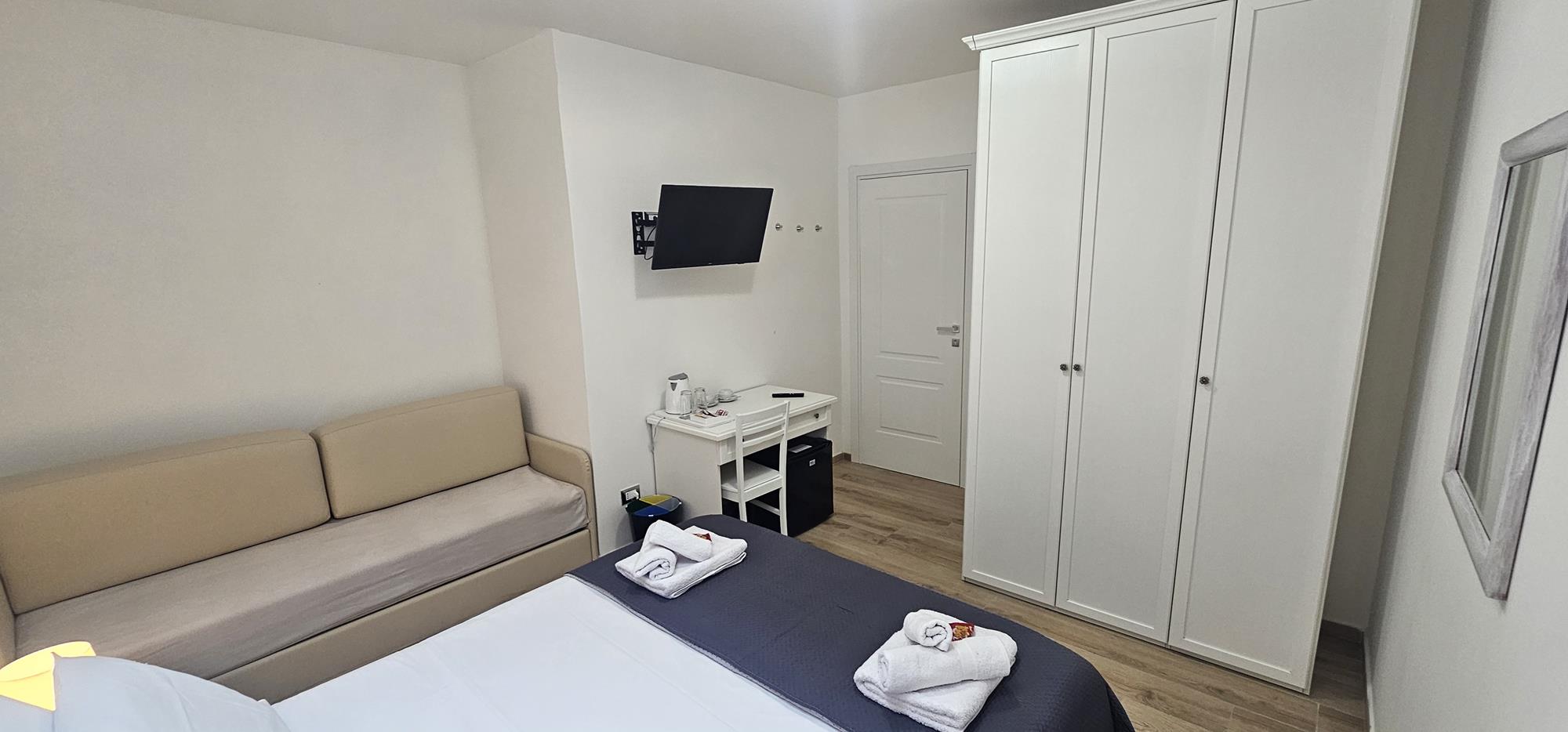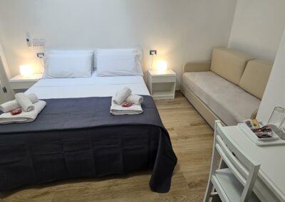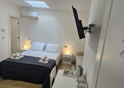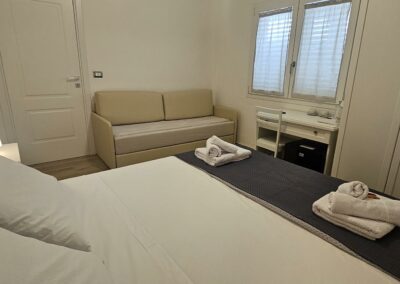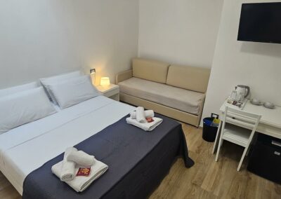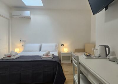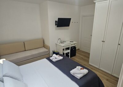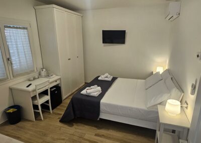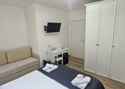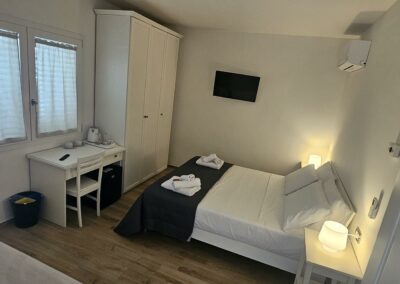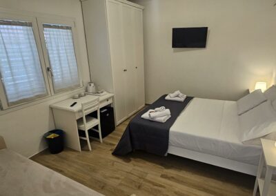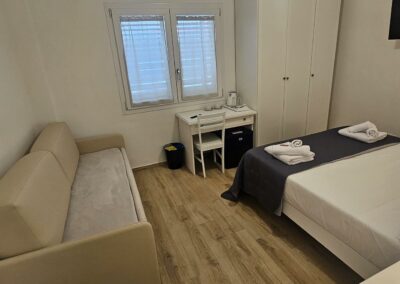 Spaziosa e funzionale, questa camera può ospitare fino a tre persone grazie al letto matrimoniale e un terzo letto aggiunto (non visibile in foto). L’ambiente è arredato con uno stile sobrio e contemporaneo, completo di armadio, scrivania attrezzata, mini frigo, TV, aria condizionata e ampie finestre con tende filtranti. Pensata per famiglie o piccoli gruppi che desiderano un soggiorno comodo e rilassante.