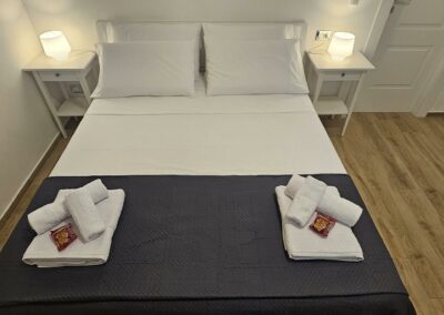 Un ambiente intimo e luminoso, arredato con gusto minimalista in tonalità chiare. Il letto matrimoniale con biancheria di qualità è affiancato da comodini con abat-jour moderne. La camera include TV a schermo piatto, aria condizionata, armadio, scrivania con set per tè/caffè e un mini frigo. Ideale per coppie in cerca di tranquillità e comfort.